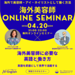 海外初心者の美容師・アイリスト・ネイリストのための『海外美容師オンラインセミナー』。「海外で働いてみたいけど、どの国が働きやすいのかよくわからない」「どうせなら一番好きな国に行きたいけどビザやライセンスが不安」といった疑問に美容専門の海外アドバイザーがわかりやすく解説、自分が最も輝ける国で海外美容師・アイリスト・ネイリストとして活躍するはじめの一歩が踏み出せます。今回は世界50カ国・1000人以上をフリーカットした旅人美容師のKoさんがスペシャルゲスト参加!美容師としての海外エピソードや海外美容師に必要なマインドについて知ることができます。